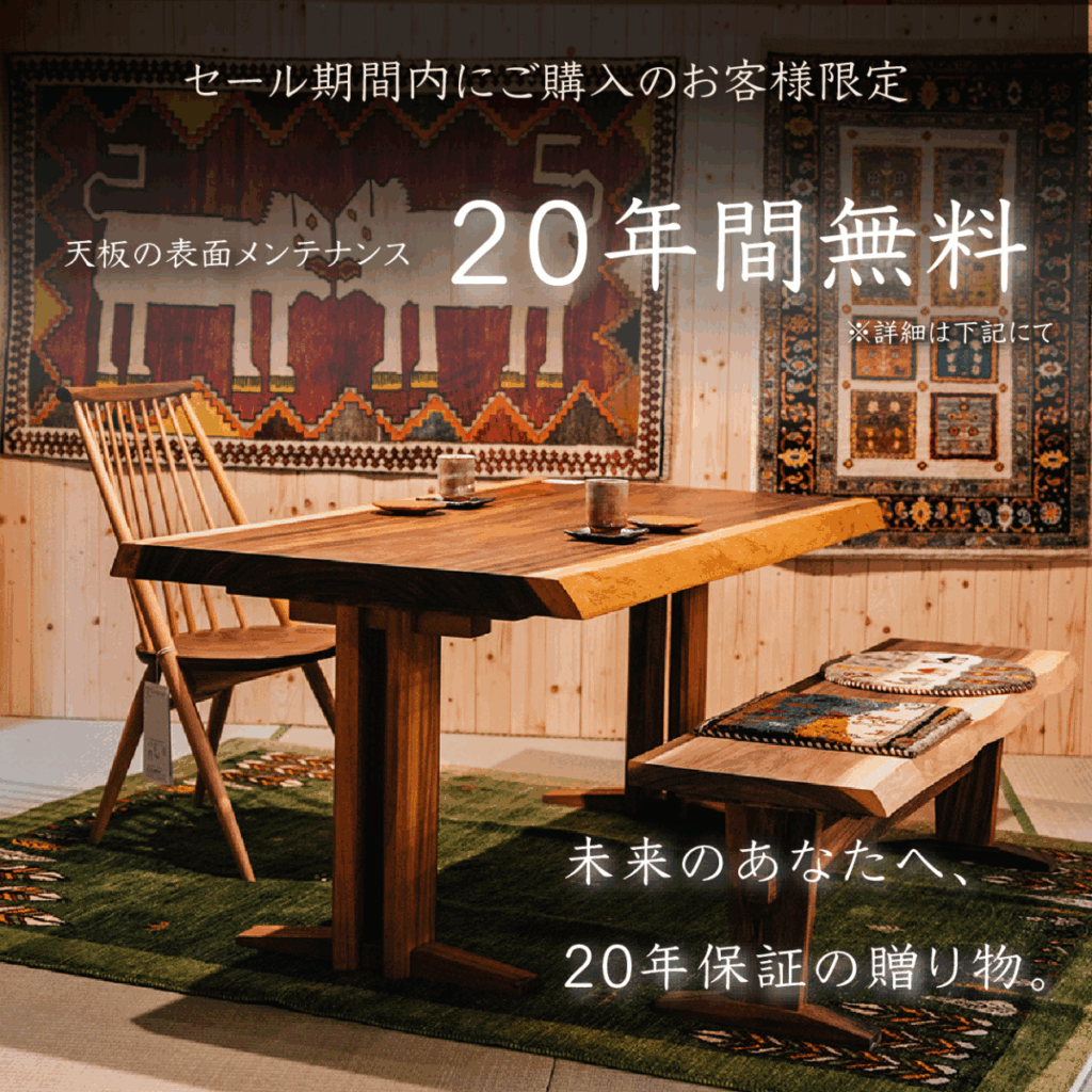 ほんの少しの研磨で新品のように生まれ変わる無垢の一枚板。あなたの一生モノを、kitoが20年間守ります。