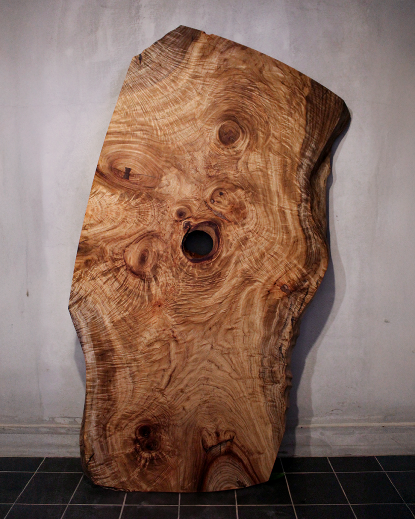 縮杢が生み出す立体的な表情は、見る角度や光の入り方によって印象が変わり、圧倒的な存在感と個性あふれる深みを生み出し、まさに自然が刻んだ造形美と呼ぶに相応しい一枚です。