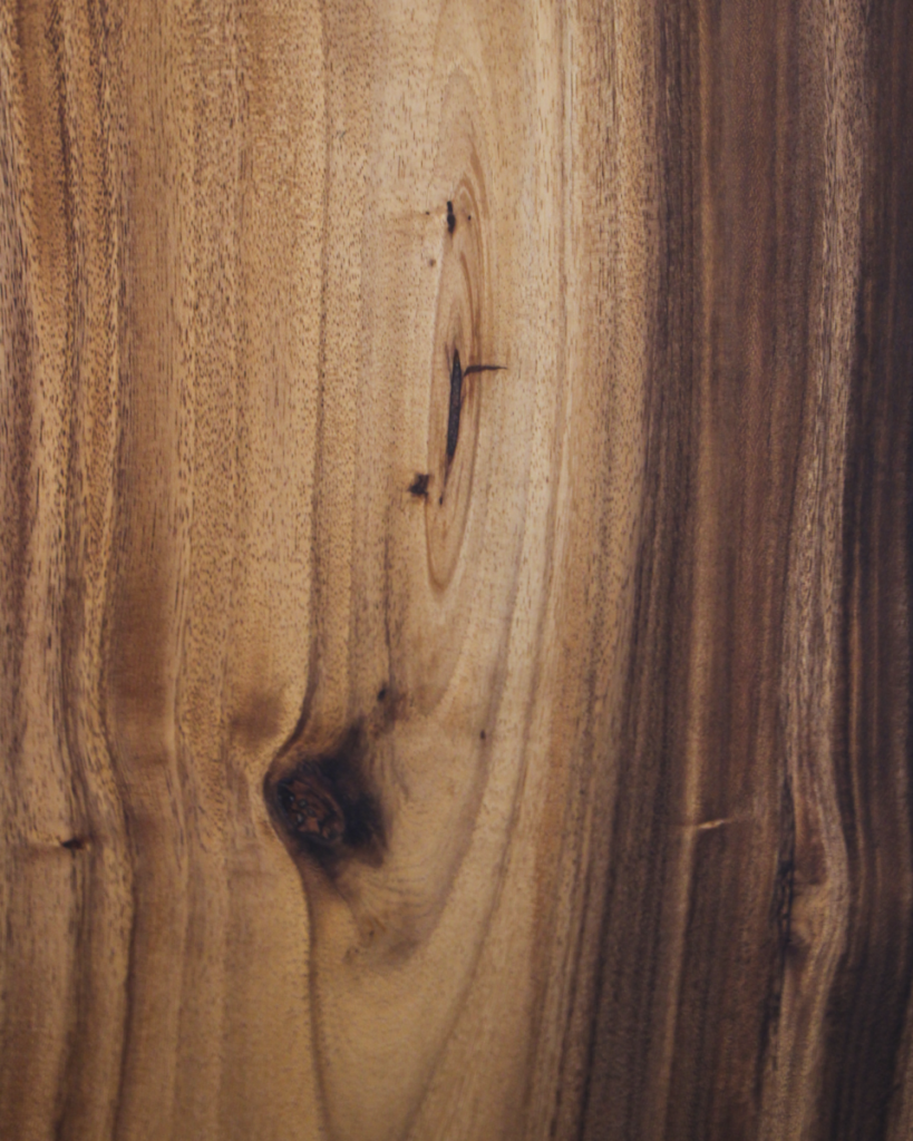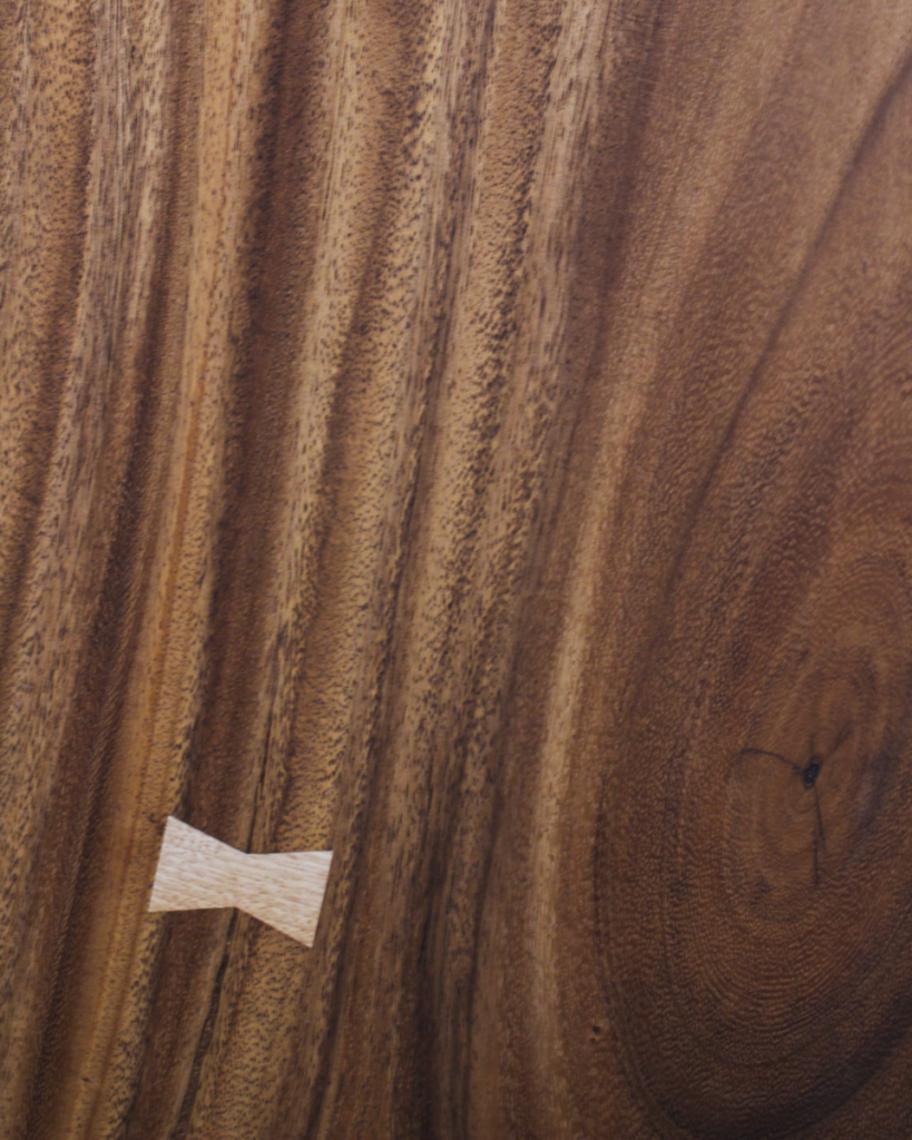 上部の割れにはウォールナットのチギリを2箇所、下からの割れにはカバザクラのチギリを入れ込み、割れの進行を抑えながら、意匠としても美しく仕上げました。