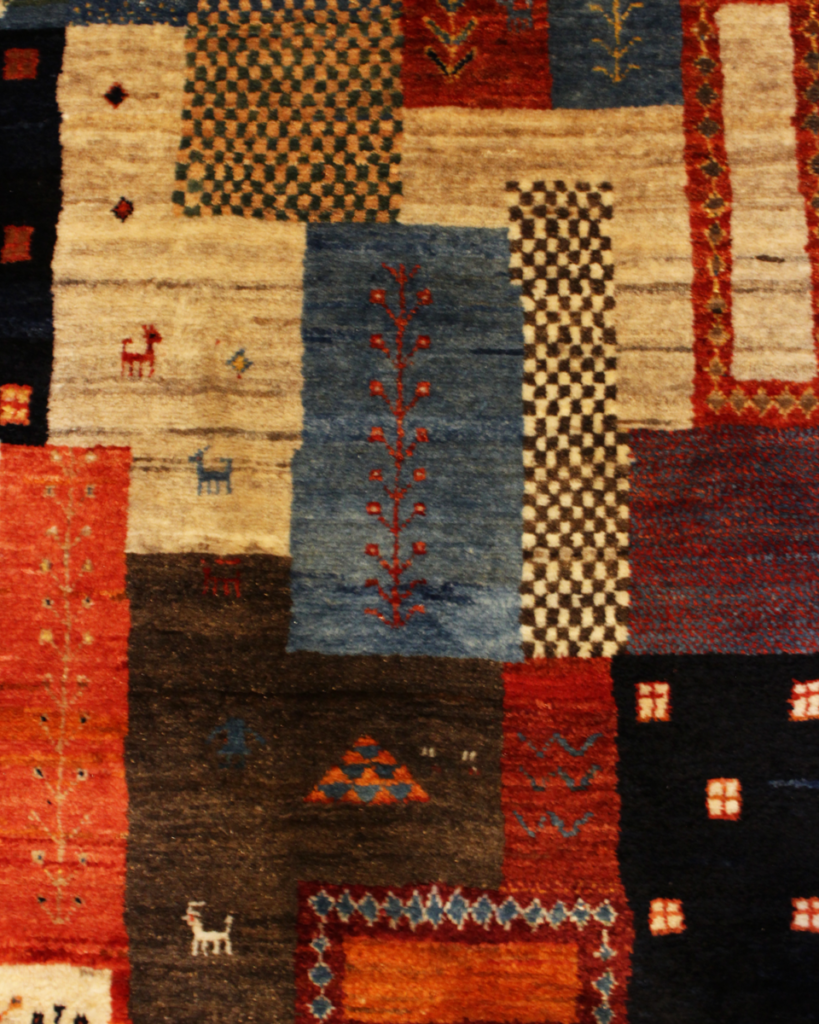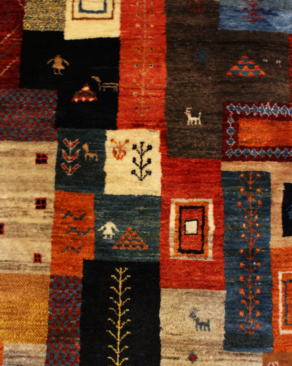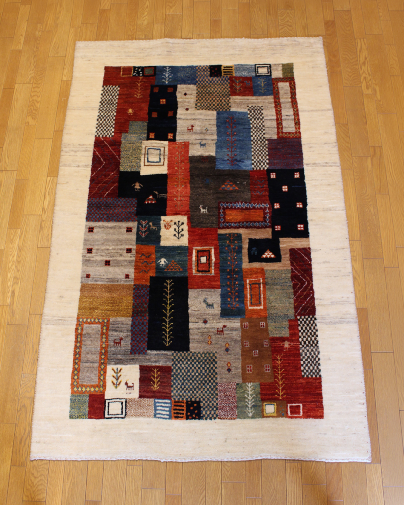 ギャッベをイランの大地に何十枚も広げ、天日干ししている様子をそのままデザインに取り込んだものと言われており、一枚で何十枚分ものギャッベを堪能出来るという何ともお得な一枚となっております。