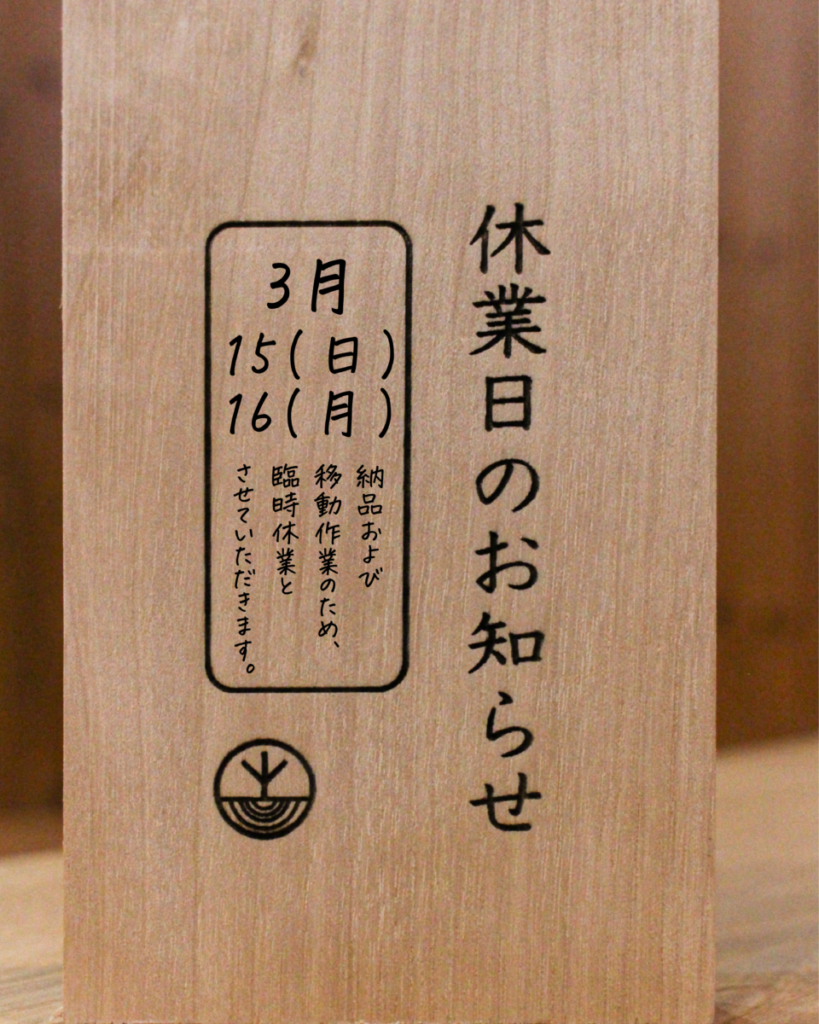 今月3月の15(日)、16(月)は納品および移動作業のため、休業とさせていただきます。ご不便をおかけいたしますが、何卒よろしくお願いいたします。